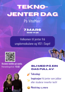 Du kan lese meir om prosjektet og Teknojentedagen på nettsidene til Vestlandsforsking https://www.vestforsk.no/nn/project/teknojenter og Sogn Næring https://www.sognnaring.no/arrangementsliste/202537-teknojentedag-p-vitemeir